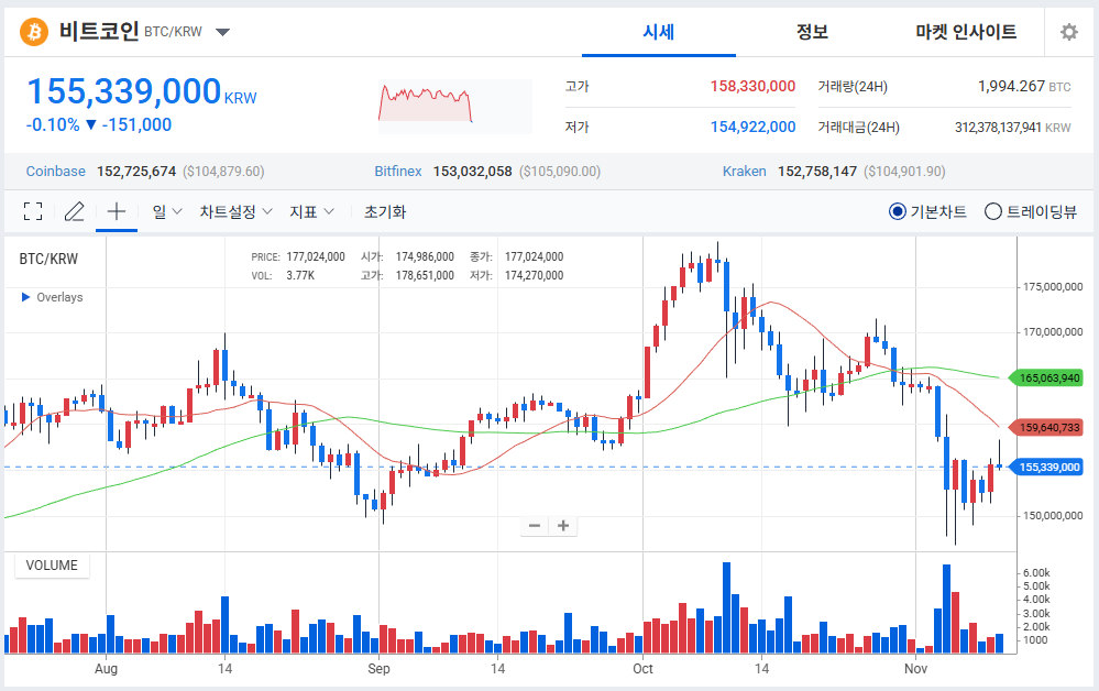 현재(2025년 기준) 비트코인은 1.6억 원을 찍고 미국 셧다운 때문에 계속 하락해서 현재 업비트 기준 1.55억 원대에서 거래 중입니다.
